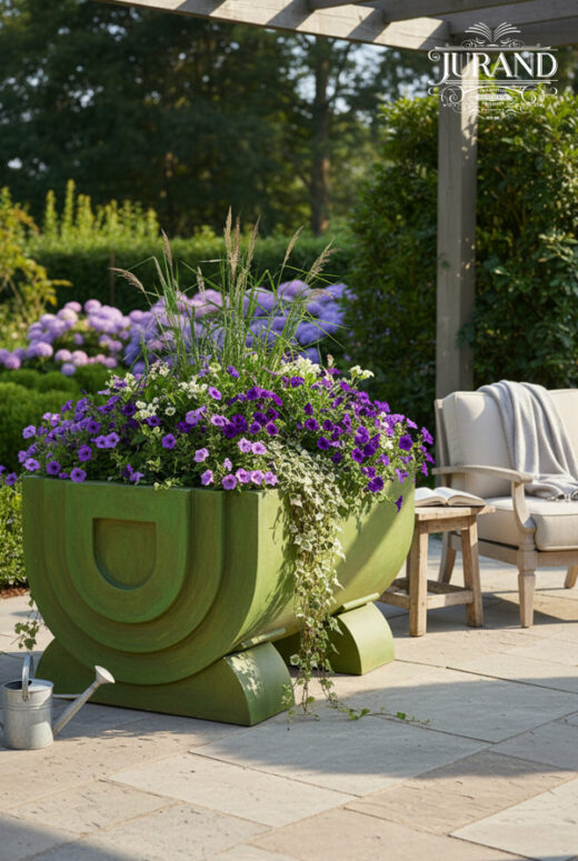 Datorită dimensiunilor generoase (înălțime 81 cm, diametru exterior 137 cm, diametru interior 91 cm), ghiveciul permite plantarea atât a florilor, cât și a arbuștilor ornamentali. Forma sa de semicerc alungit, finisajul neted și detaliile simetrice îi conferă un aspect sofisticat, potrivit pentru grădini romantice, clasice sau rustice.