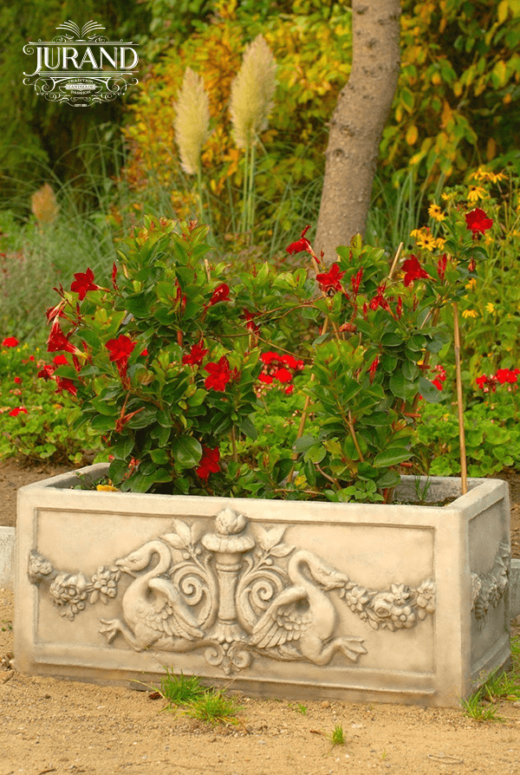 Jardiniera se remarcă prin dimensiunile sale generoase și construcția masivă, fiind susținuta de picioare elegante în formă de frunză. Suprafața este decorată cu un relief spectaculos reprezentând două lebede împodobite cu coroane de flori, simbol al eleganței și rafinamentului. Acest detaliu artistic transformă produsul într-un punct focal în orice grădină sau terasă.